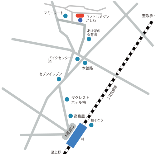 | 東武野田線 | 東武野田線 柏駅 下車 西口から徒歩約15分 |